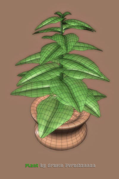 A wireframe render of the plant. This model has had the leaf objects editted to conform to the shape of the leaf, to solve the shadowing problem. There are additional advantages to this approach: a reduced polygon count and faster rendering.